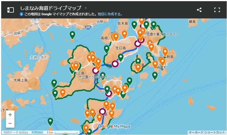ドライブで立寄りやすいしまなみ海道の観光スポットや好景観スポット、レストランなどの情報をGoogleマイマップに落として「しまなみ海道ドライブマップ」を作成してみました。個人的に好きなポイント、駐車場もあり立寄りやすい場所を中心にピックアップしています。スマートフォンのGoogleマップアプリでも活用することができます。